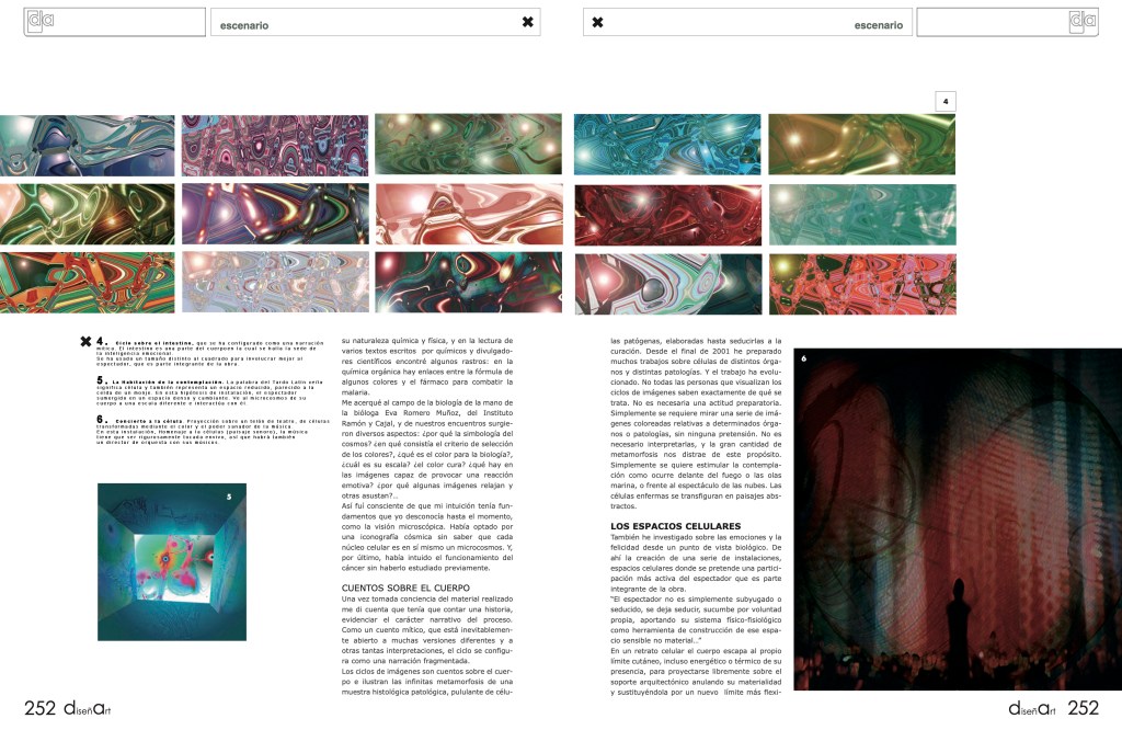 Cells are transformed into a map of consciousness, biological landscapes into maps of being, in which the body is represented as an icon, a sacred subject and not a codified set of organs and functions. Attracted by the idea of architecture as an interior mirror in which intimacy becomes landscape, I imagined “total installations” made of cells to shape sensitive spaces in which to stimulate the senses, activate endorphins and the dormant parts of the brain.