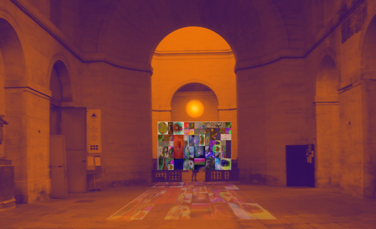 Un gran lienzo transparente pululante de células transfiguradas de distintos órganos, colgado a cierta distancia de la pared, está iluminado con luces que proyectan las texturas celulares y sus colores sobre el cuerpo del espectador.