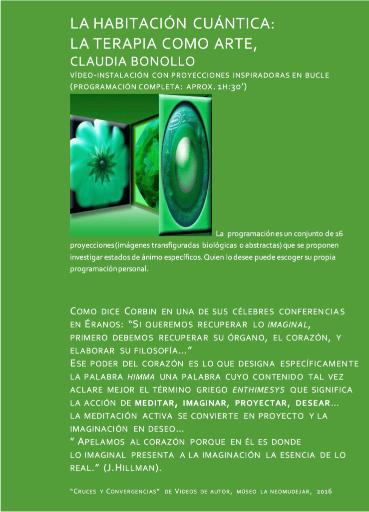 Investiga la imaginación activa, la luz y el color a través del estudio de los místicos más visionarios: Ib’n Arabi, Sohravardi y Najmoddin Kobrâ, magistralmente presentados por H. Corbin que además recuerda: “Si queremos recuperar lo imaginal, primero debemos recuperar su órgano, el corazón, y elaborar su filosofía…” “Ese poder del corazón es lo que designa específicamente la palabra himma una palabra cuyo contenido tal vez aclare mejor el término griego enthimesys que significa la acción de meditar, imaginar, proyectar, desear…”.