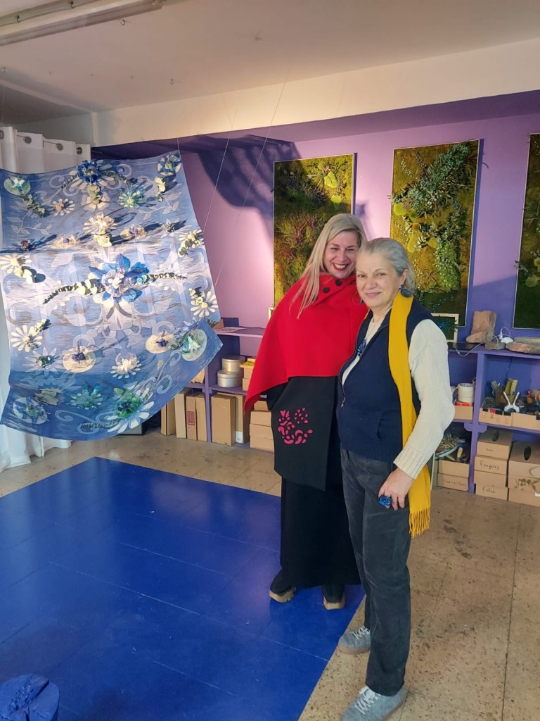 En las alfombras voladoras, se reúnen muchos temas: la oración y la levitación, el vuelo vertical o la ascensión, el canto armónico que dirige y sugiere las pautas del meticuloso trabajo del telar… La inspiración nace del extraordinario artesanado textil del área de la Magna Grecia calabresa, cuyas tramas y urdimbres surgen de una tradición oral cantada. Las “canciones ritmadas”, tipo de cantinelas femeninas que inspiran los motivos decorativos textiles. Además, Wanda desciende de una de estas mujeres cantadoras.
