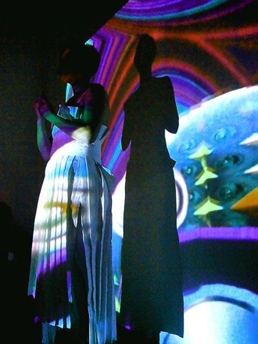 El traje de escena, una escultura-origami de tejido, sobre la cual se proyectan imagenes digitales elaboradas artisticamente por Claudia Bonollo y que representan analogas metamorfosis en otros planos, ha sido tambiรฉn diseรฑado por Claudia Bonollo y Andrea Buchner .